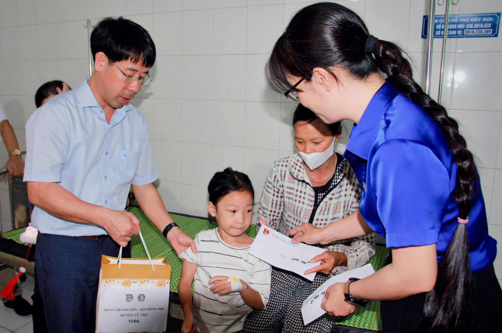 Lãnh đạo Huyện đoàn huyện Vũ Thư, Bệnh viện Đa khoa huyện Vũ Thư đã đến từng giường bệnh thăm hỏi sức khỏe và tình hình học tập của các bệnh nhi, đồng thời trao tặng 30 suất quà gồm: bánh Trung thu, lồng đèn và sữa cho 30 bệnh nhi đang điều trị nội trú tại Khoa Nhi và Khoa Phụ sản của Bệnh viện. Trong đó, có 7 suất quà đặc biệt, mỗi suất quà trị giá 400.00 đồng dành cho 7 bệnh nhi có hoàn cảnh đặc biệt khó khăn với mong muốn mang đến cho các bệnh nhi một cái tết Trung thu ngập tràn niềm vui và hạnh phúc; khích lệ các bệnh nhi chiến thắng bệnh tật, sớm trở về học tập, rèn luyện.