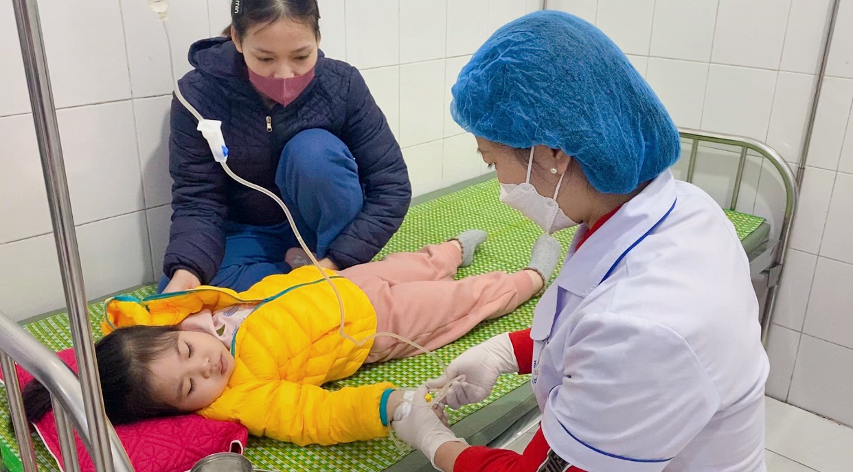 Trung bình mỗi ngày, khoa Nhi tiếp nhận từ 7 – 9 ca mới vào điều trị, số lượng bệnh nhân có xu hướng tăng nhẹ so với ngày thường. Bệnh nhi nhập viện chủ yếu mắc các bệnh như: viêm phổi, sốt xuất huyết, sốt virus, cúm… Nguyên nhân trẻ mắc bệnh gia tăng là do thời tiết thay đổi đột ngột, đây là điều kiện thuận lợi cho các loại vi rút, vi khuẩn gây bệnh phát triển. Bệnh nhi từ 1 tháng tuổi đến dưới 36 tháng tuổi, sức đề kháng còn yếu, chưa thích nghi khi trời chuyển rét nên dễ mắc bệnh, bệnh nặng. Bác sĩ CKI Nguyễn Văn Thoan, Trưởng khoa Nhi, Bệnh viện Đa khoa huyện Vũ Thư cho biết: Khi trẻ bệnh, cha mẹ cần chú ý theo dõi dấu hiệu bệnh trở nặng như: sốt cao, đau đầu, nôn nhiều…để đưa trẻ đến bệnh viện kịp thời, không nên tự điều trị tại nhà.