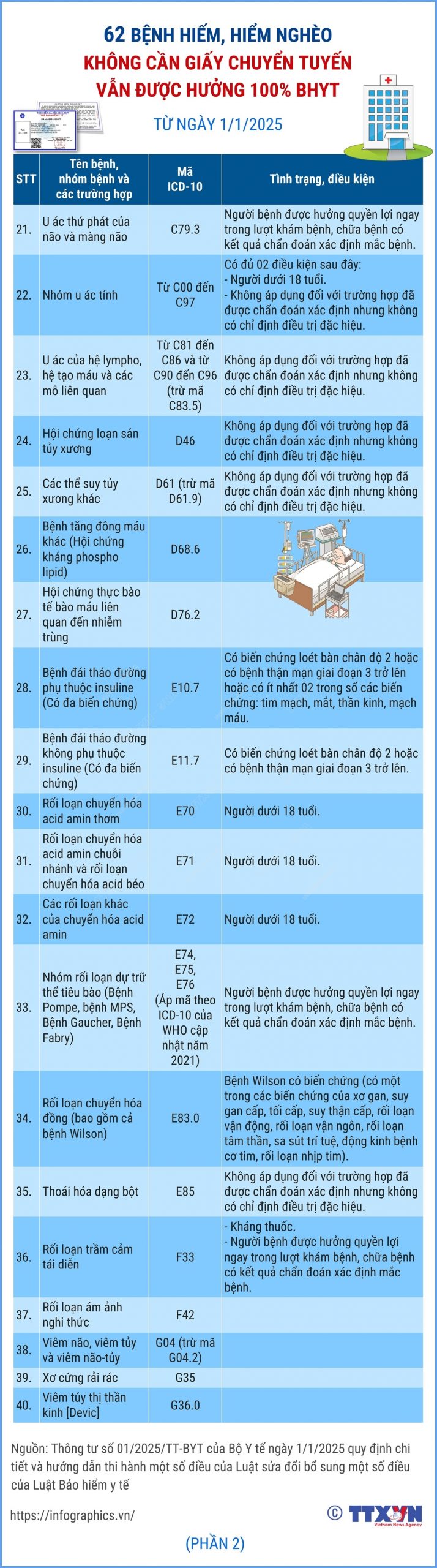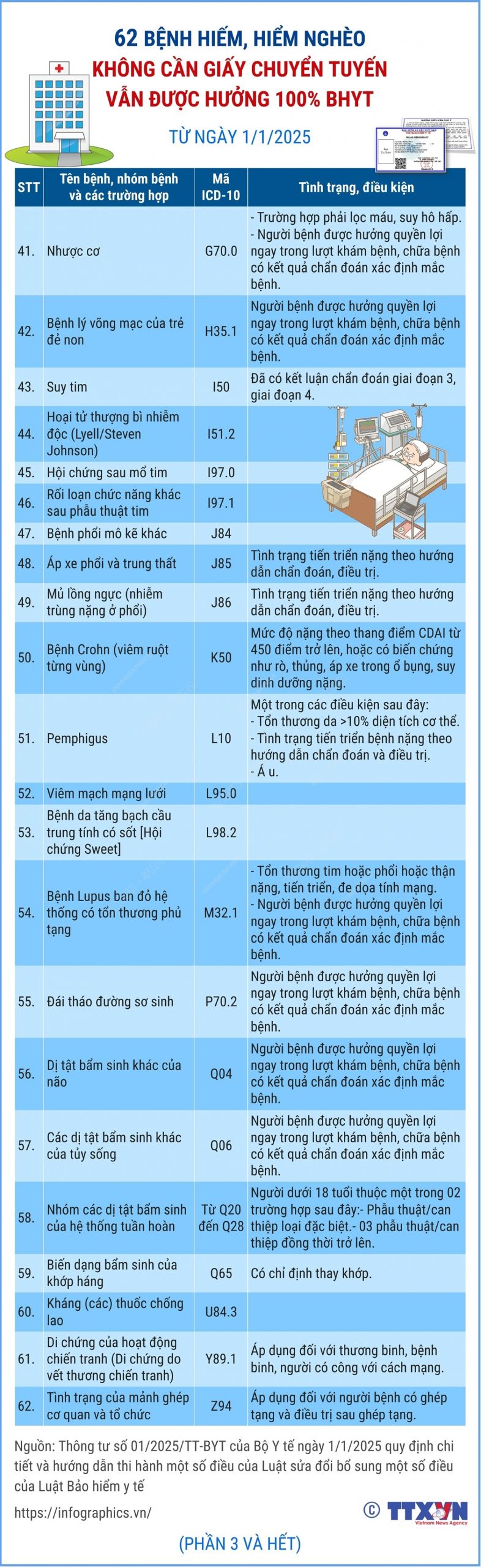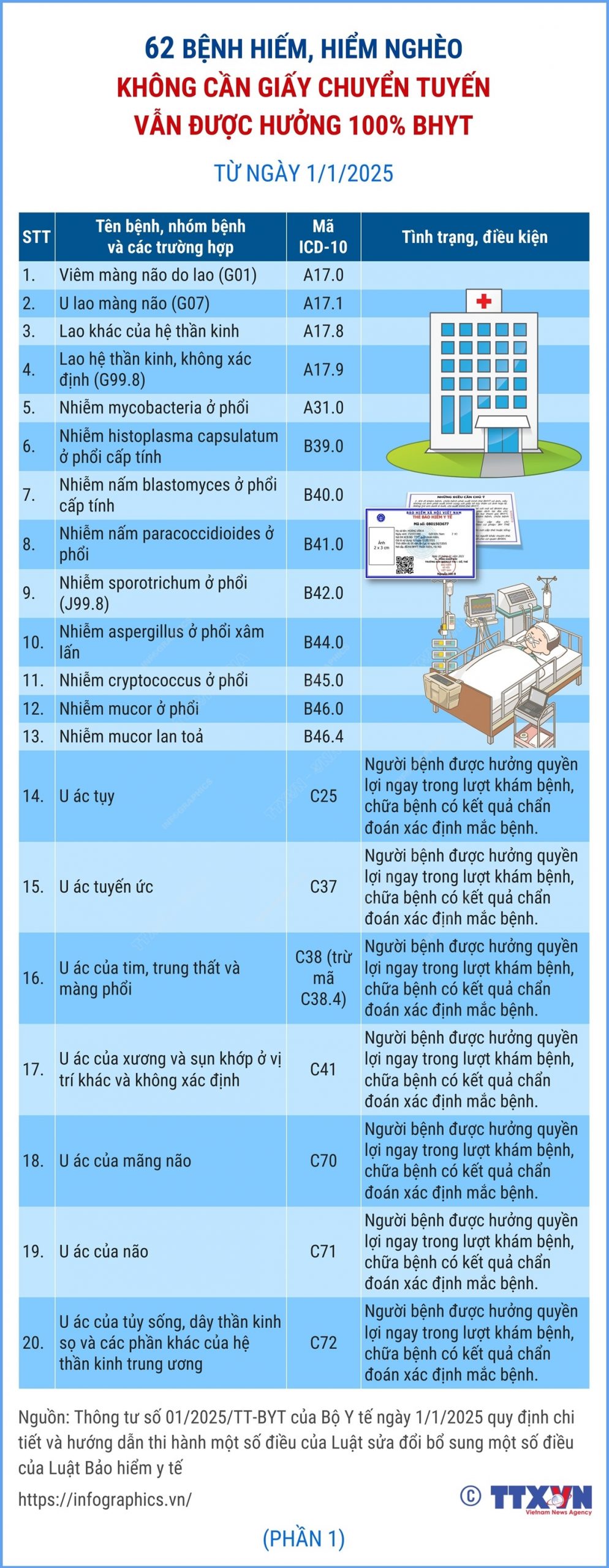 Bộ Y tế vừa ban hành Thông tư số 01/TT-BYT quy định chi tiết và hướng dẫn thi hành một số điều của Luật sửa đổi bổ sung một số điều của Luật Bảo hiểm y tế (BHYT), trong đó có quy định một số bệnh hiếm, bệnh hiểm nghèo được lên thẳng cơ sở khám chữa bệnh cấp chuyên sâu, không cần giấy chuyển tuyến vẫn được hưởng BHYT 100%. Thông tư có hiệu lực thi hành từ ngày 1/1/2025.