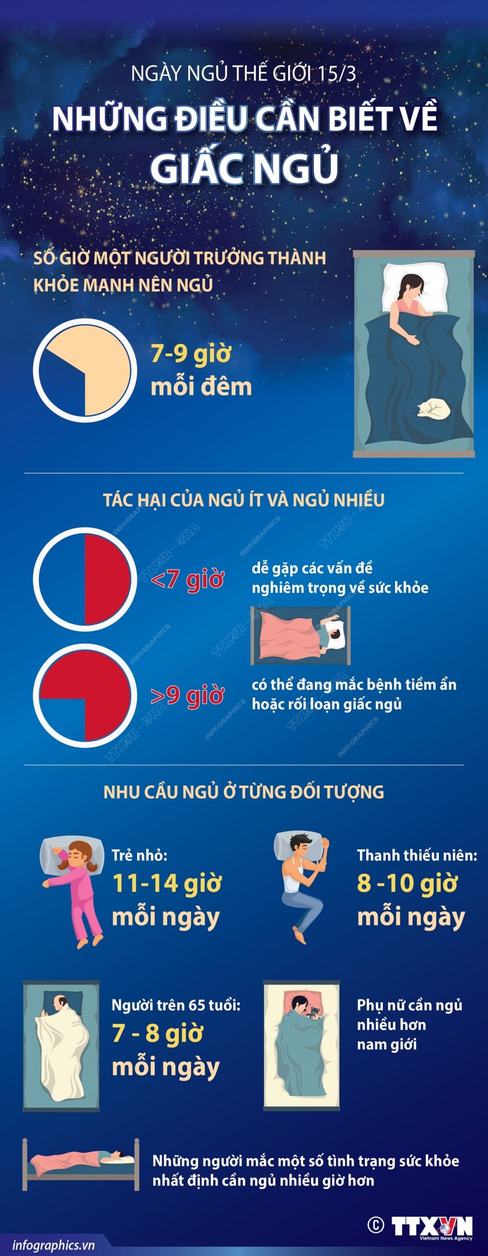 Theo các nhà nghiên cứu, một người trưởng thành khỏe mạnh nên ngủ từ 7-9 giờ mỗi đêm. Những người ngủ dưới 7 giờ dễ gặp các vấn đề nghiêm trọng về sức khỏe vì cơ thể và não của họ có thể bị ảnh hưởng xấu bởi tình trạng thiếu ngủ mãn tính. Ngược lại, những người ngủ hơn 9 giờ có thể đang mắc bệnh tiềm ẩn hoặc rối loạn giấc ngủ.