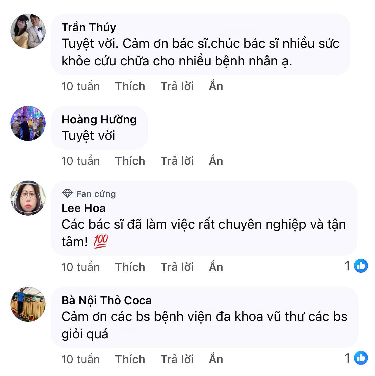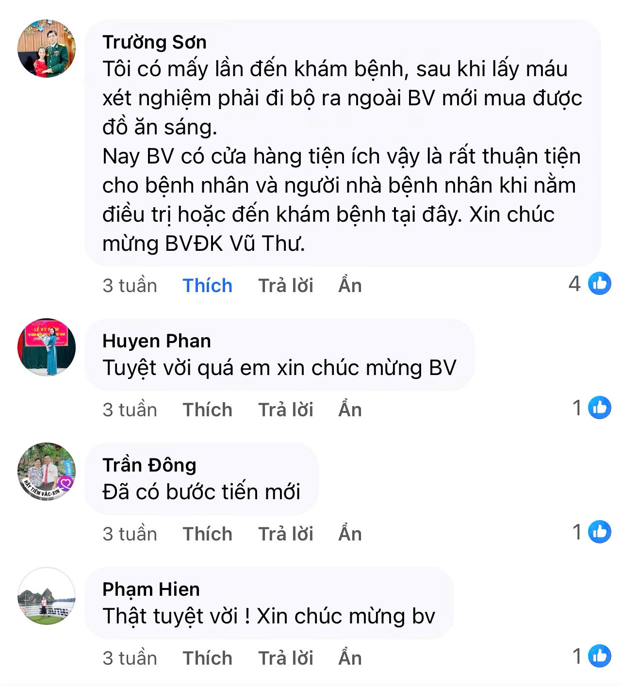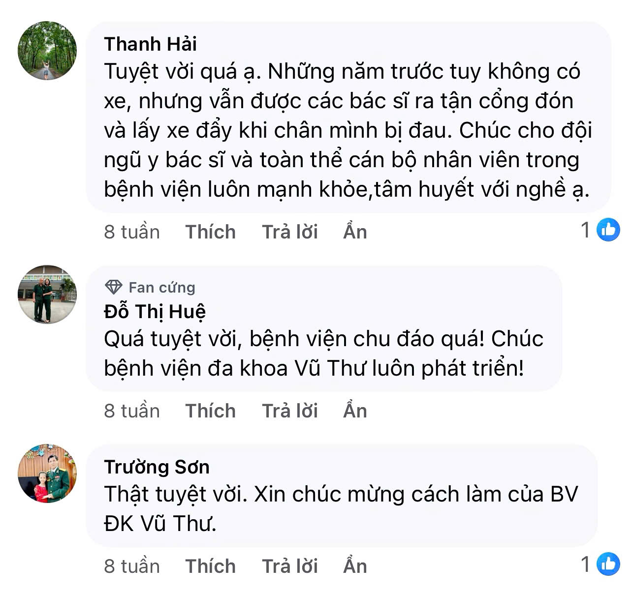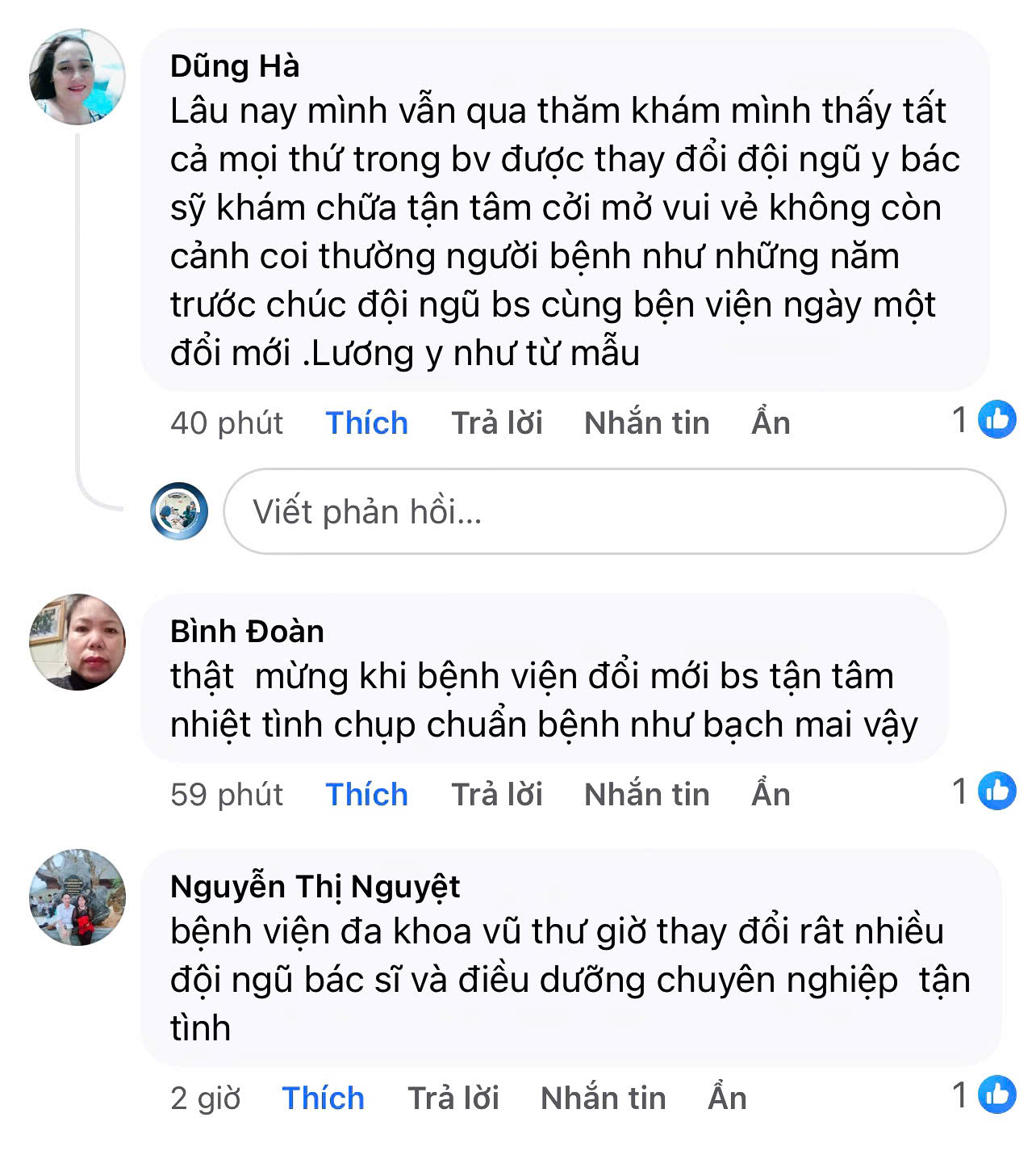 Bệnh viện Đa khoa Vũ Thư xin trân trọng gửi lời cảm ơn tới quý người bệnh đã dành những bình luận và chia sẻ tích cực cho bệnh viện trong suốt thời gian qua. Bệnh viện vô cùng trân quý từng lời nhận xét, góp ý và sự ghi nhận mà quý người bệnh đã dành cho cán bộ, viên chức, người lao động của bệnh viện.