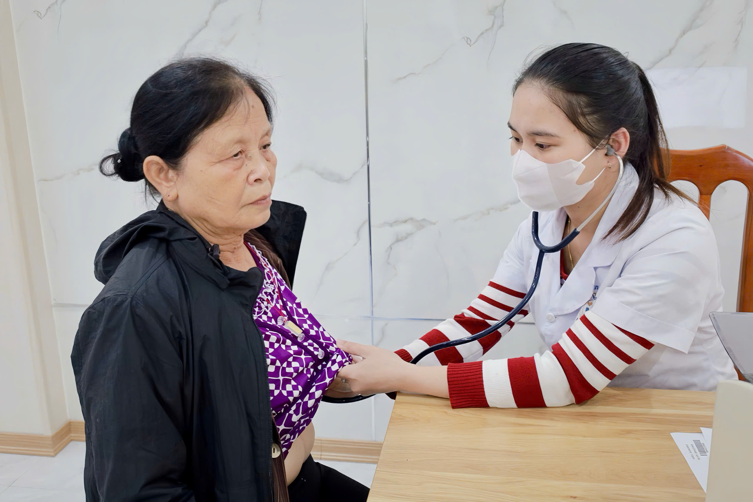 Bác sĩ Bệnh viện Đa khoa Vũ Thư kiểm tra sức khoẻ cho người dân.