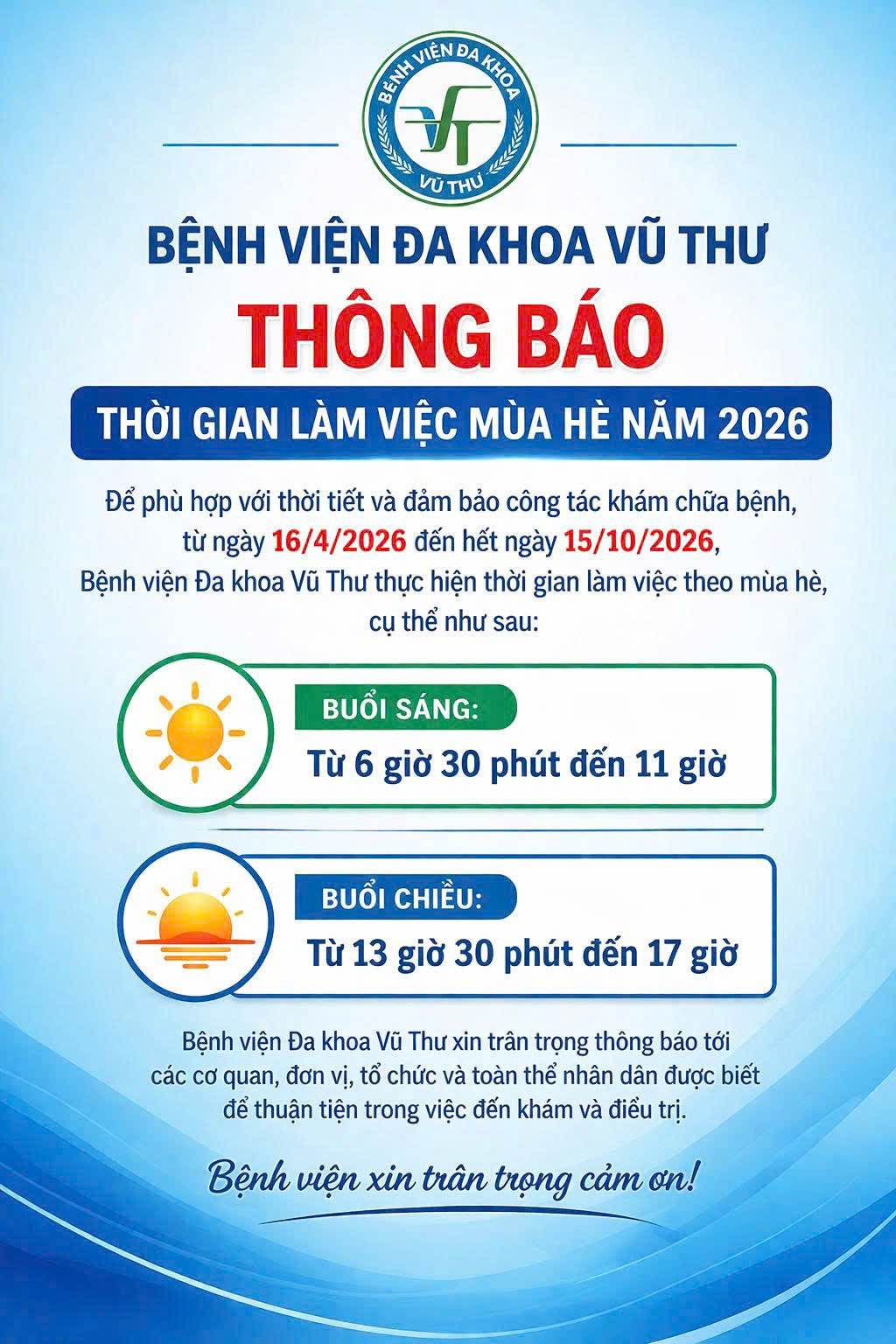 Để phù hợp với thời tiết và đảm bảo công tác khám chữa bệnh, từ ngày 16/4/2026 đến hết ngày 15/10/2026, Bệnh viện Đa khoa Vũ Thư thực hiện thời gian làm việc theo mùa hè, cụ thể như sau: